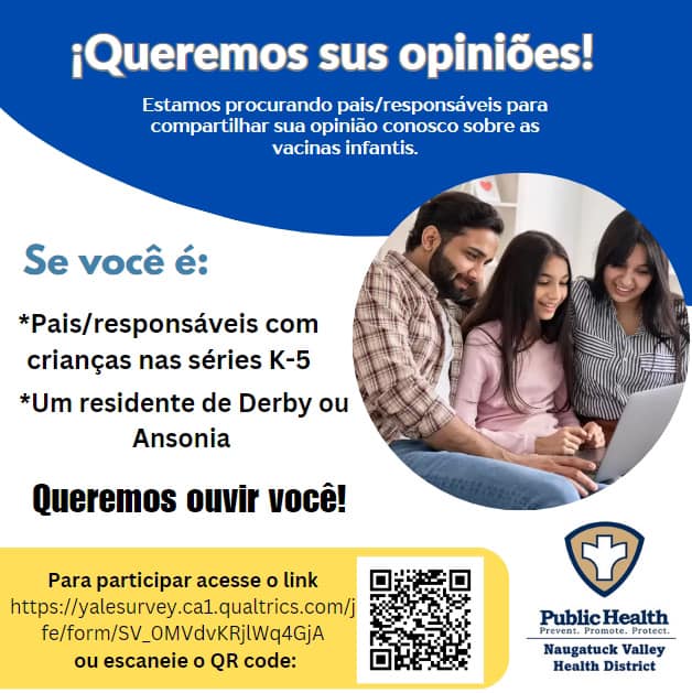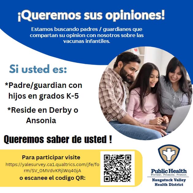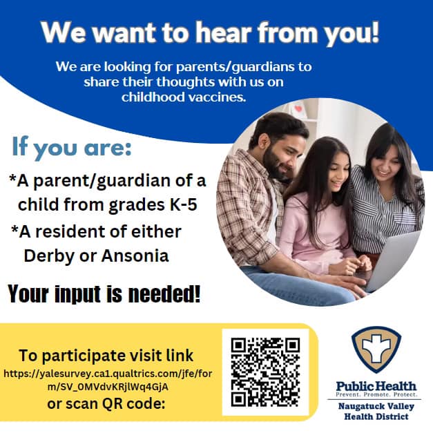 The Yale-Griffin Prevention Research Center (Y-G PRC), in collaboration with the Naugatuck Valley Health District, is conducting a survey to understand communication channels and residents’ thoughts about routine childhood vaccines. This information will help to improve vaccine confidence and uptake efforts. You are being invited to participate in this survey because you are a parent or guardian who lives in Ansonia or Derby.