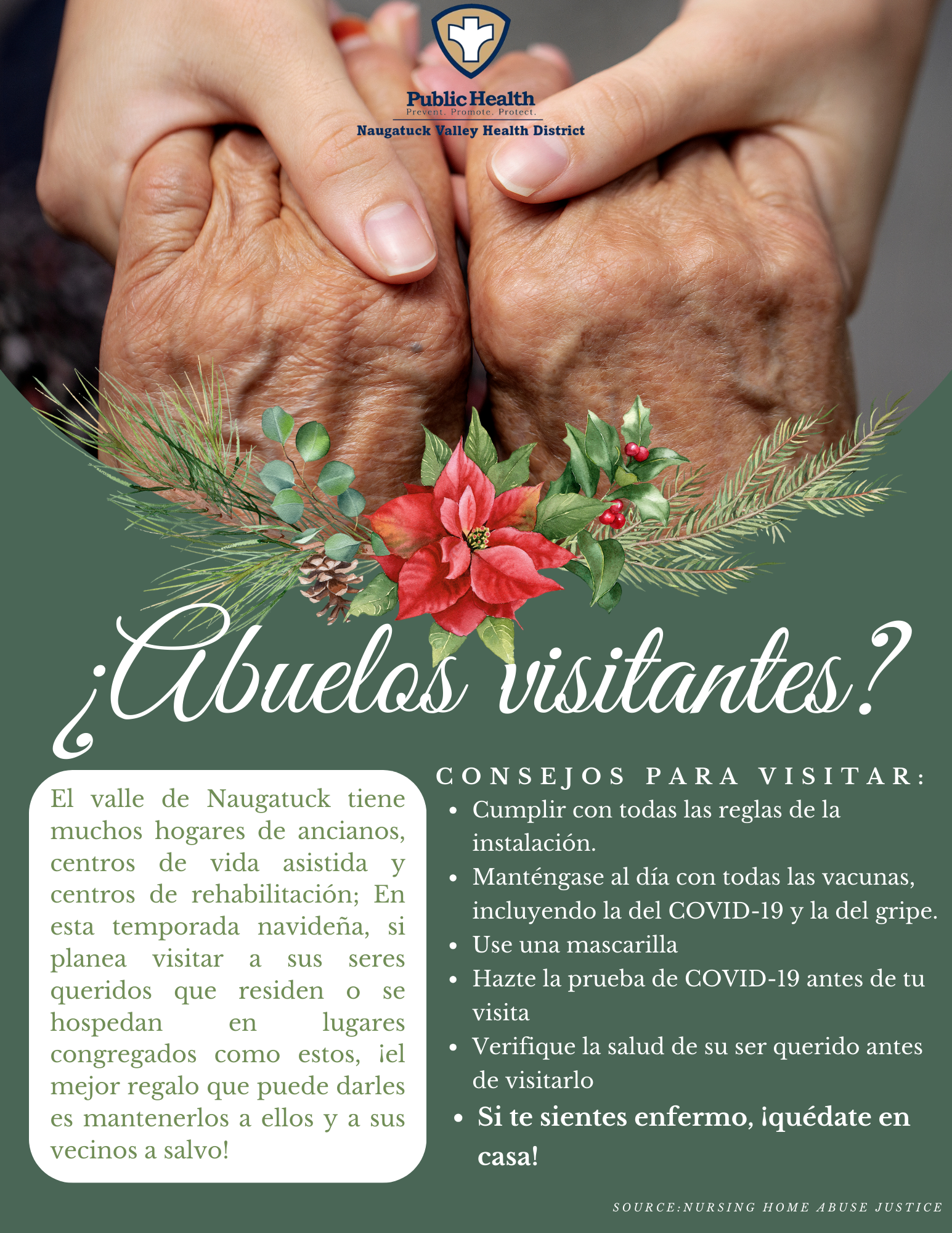 Los días festivos son un buen momento para ponerse al día con sus seres queridos y, a veces, eso significa visitar a amigos y familiares en lugares congregados. El Valle alberga muchos hogares de ancianos, centros de vidas asistidas y centros de rehabilitación; Si planea visitar a alguien que vive o se hospeda actualmente en una instalación como esta, es importante tomar precauciones adicionales para proteger a todos los residentes. ¡Siga leyendo para algunos consejos útiles sobre cómo mantener a sus seres queridos saludables y recuerde a pasar por NVHD para obtener una prueba de COVID-19 gratuito antes de cualquier visita navideña! Llame a Paulina al (203) 881-3255, ext. 118 para reservar un examen (las cantidades son limitadas).