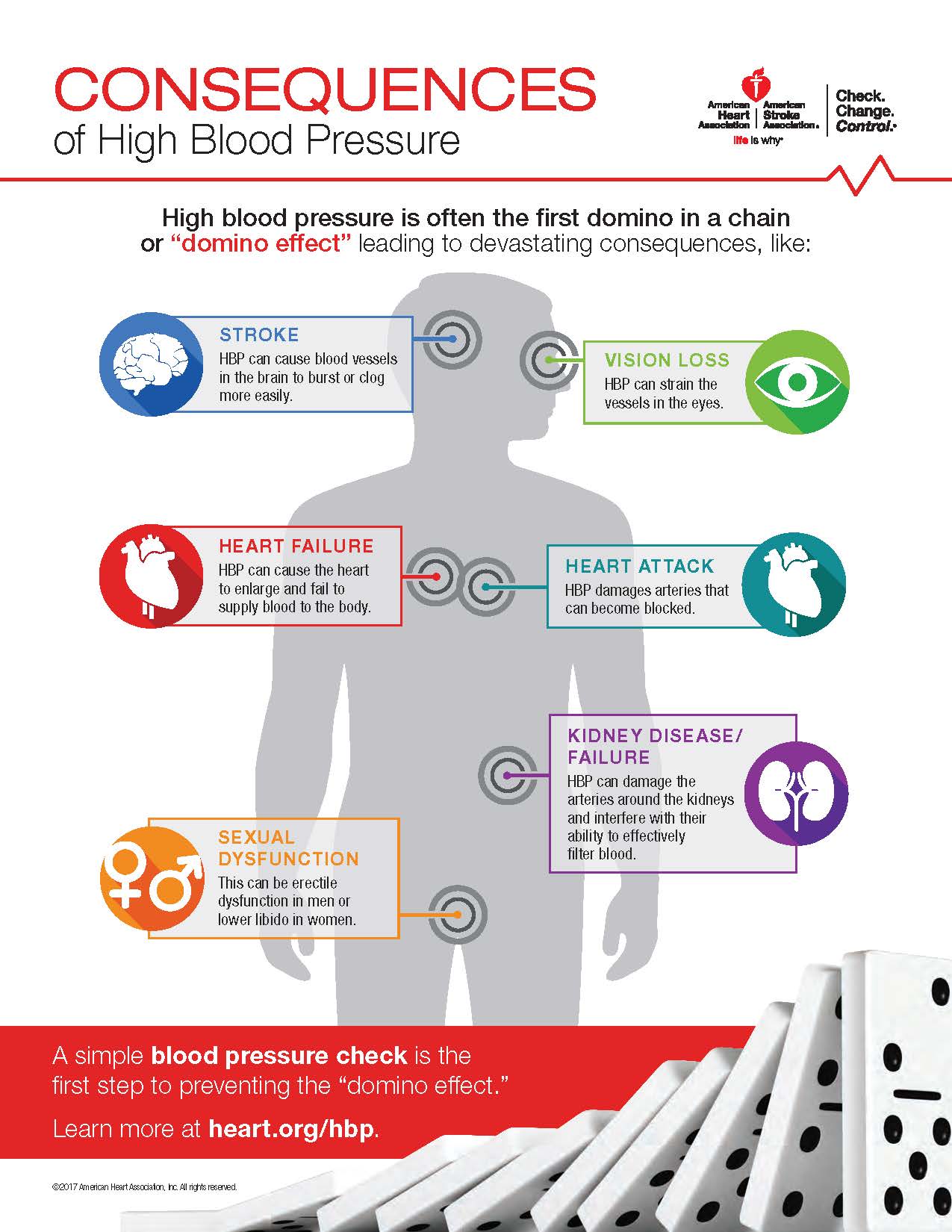 - Heart attack — High blood pressure damages arteries that can become blocked and prevent blood flow to the heart muscle.