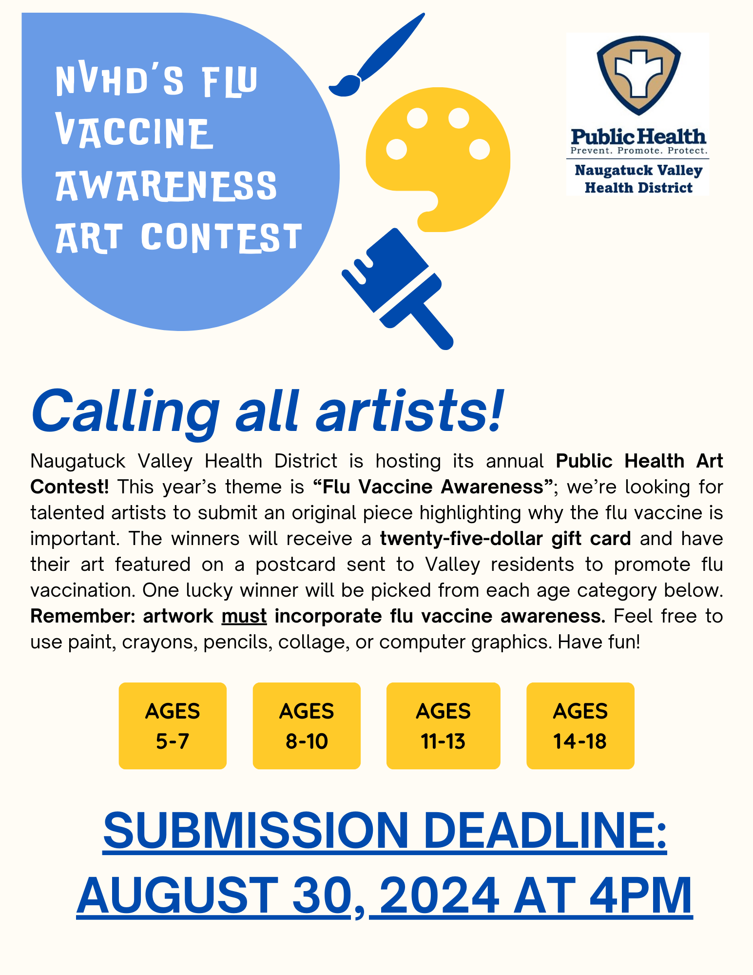 Naugatuck Valley Health District is holding its third Valley-wide Public Health Art Contest, and we are inviting youth/students/campers/etc. around the Valley to participate! We are seeking your help in spreading the word and encouraging submissions.