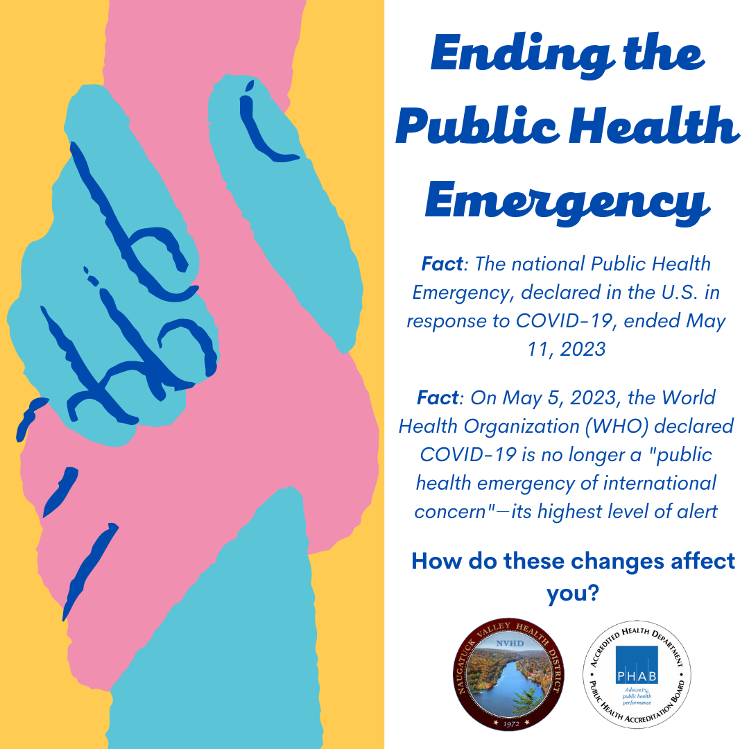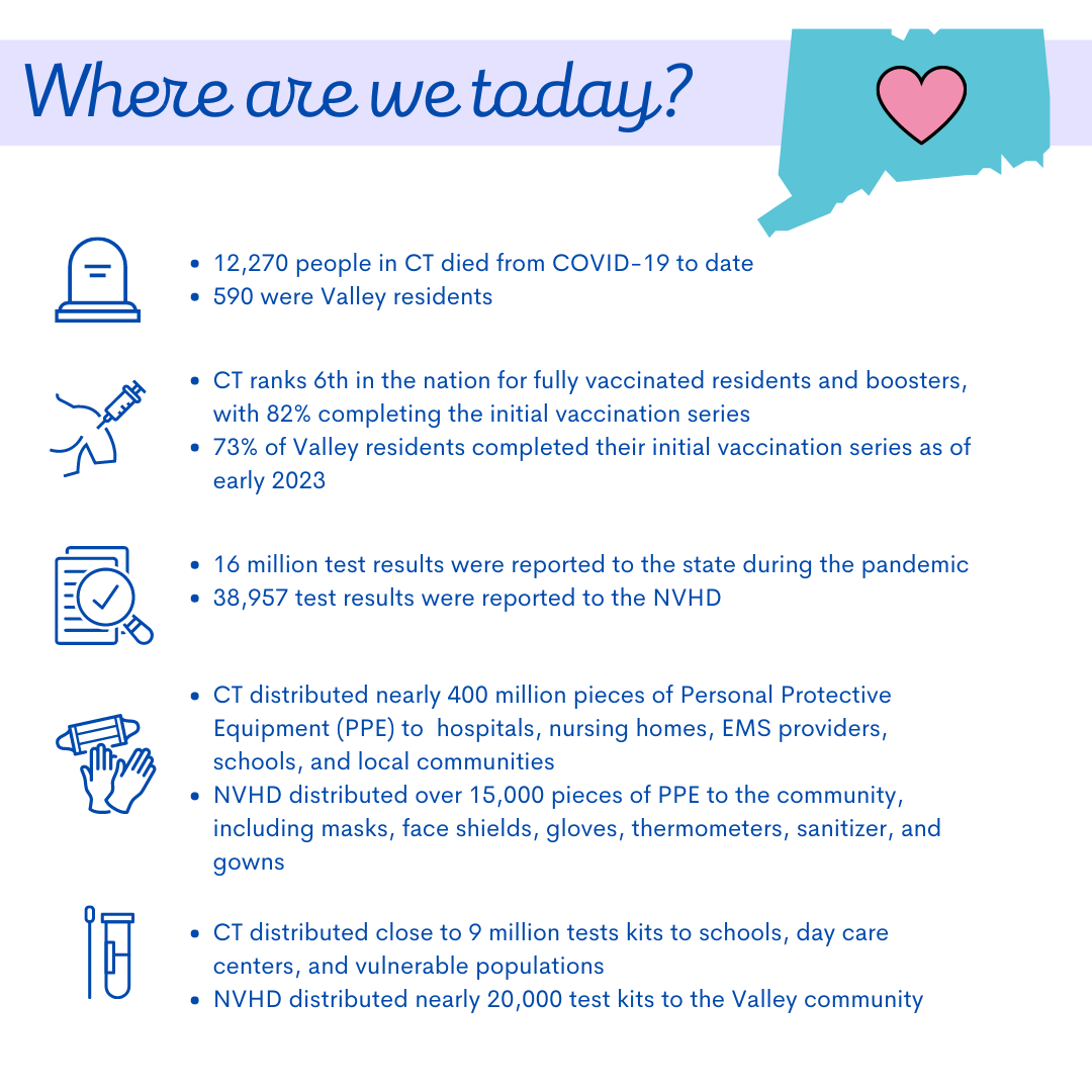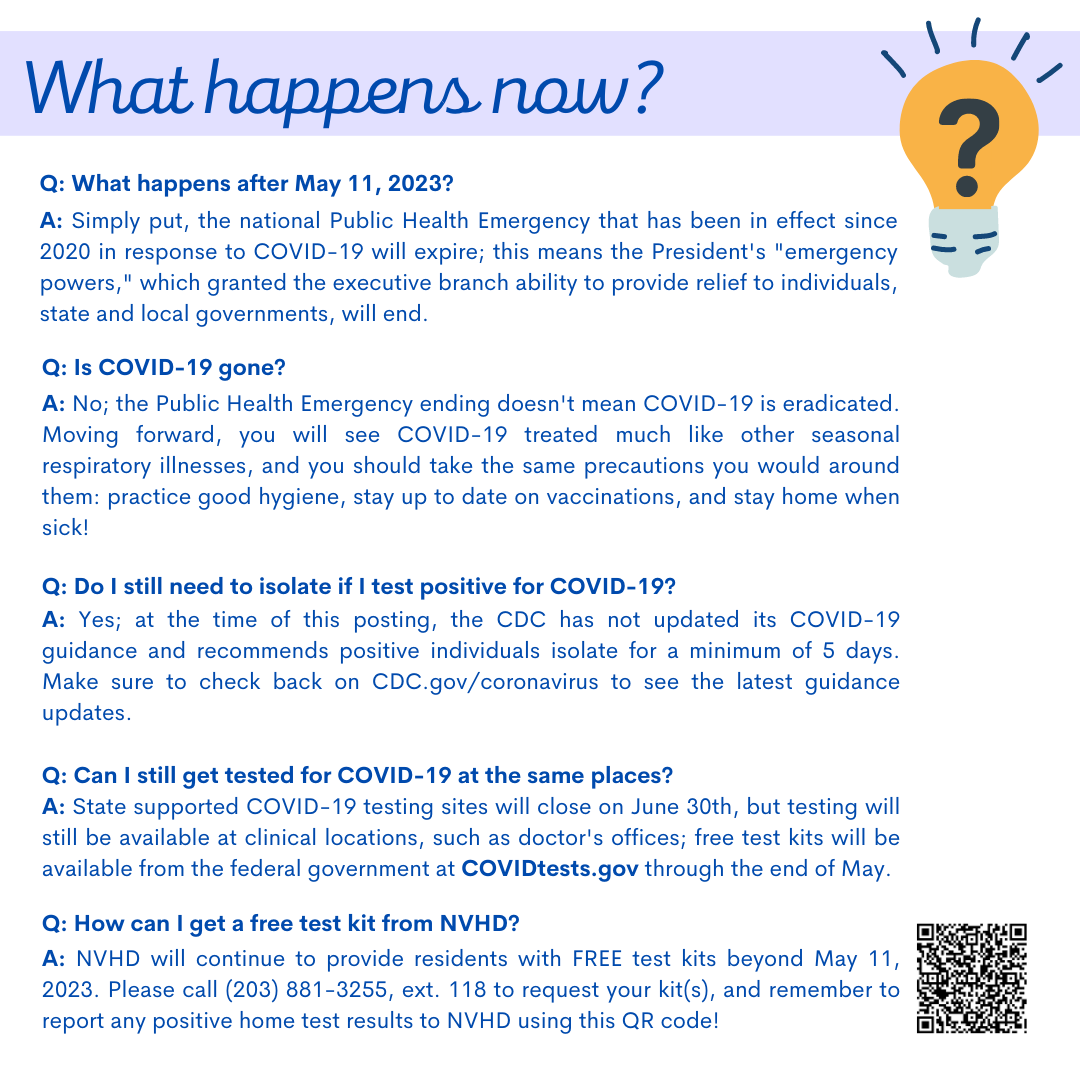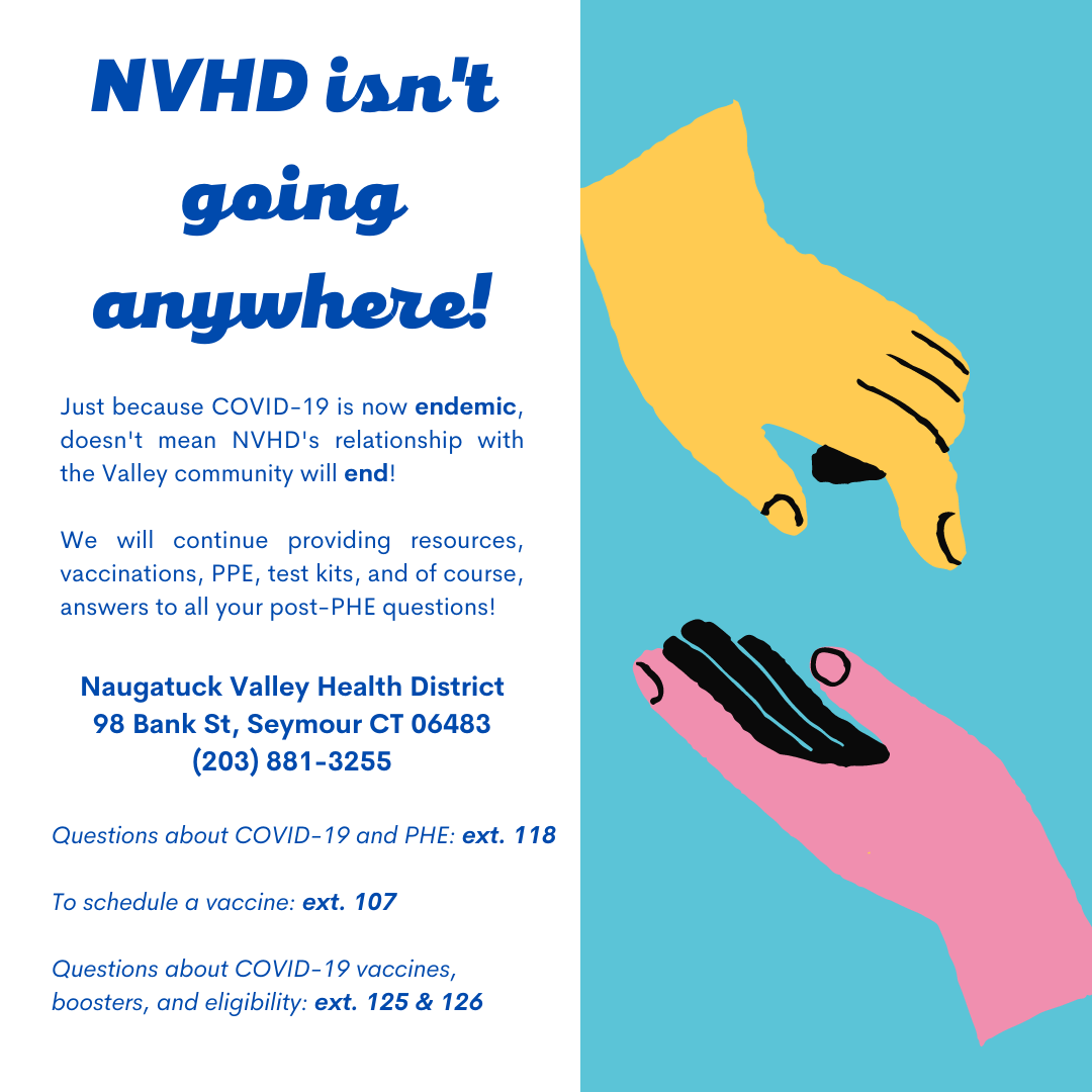 Just because COVID-19 is now endemic, doesn’t mean NVHD’s relationship with the Valley community will end! We will continue providing resources, vaccinations, PPE, test kits, and of course, answers to all your post-PHE questions! Scroll for more important information from Naugatuck Valley Health District regarding the end of the public emergency declaration for COVID-19 and what that means for you.