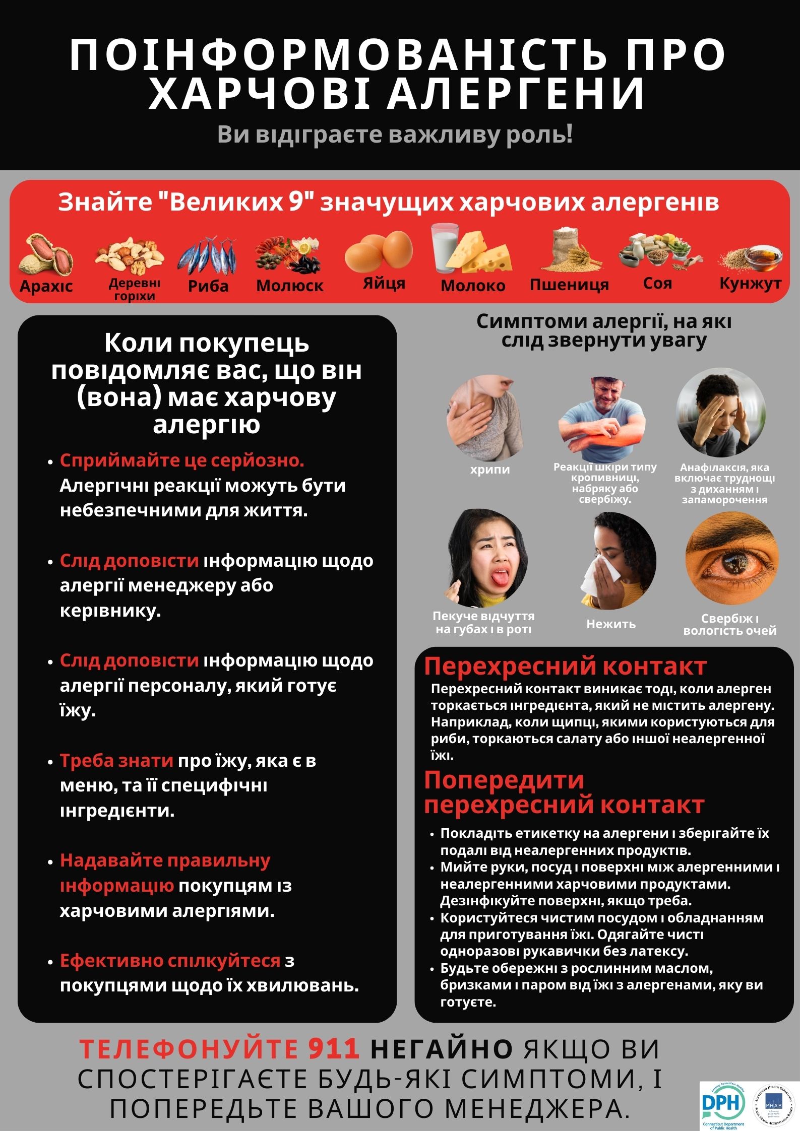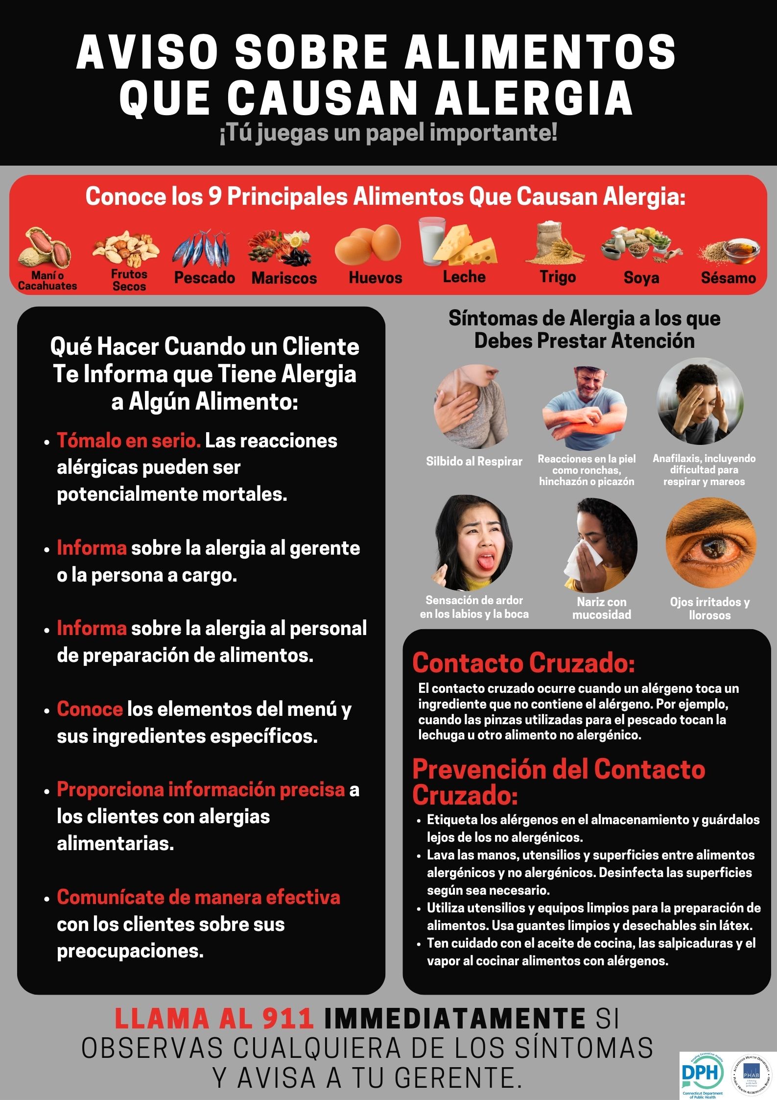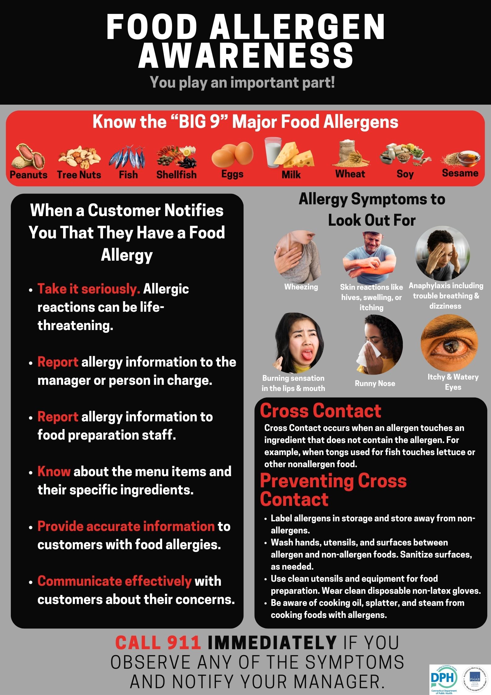 - The need to contact the 911 emergency telecommunications number if a customer has an allergic reaction while on the premises of such food establishment