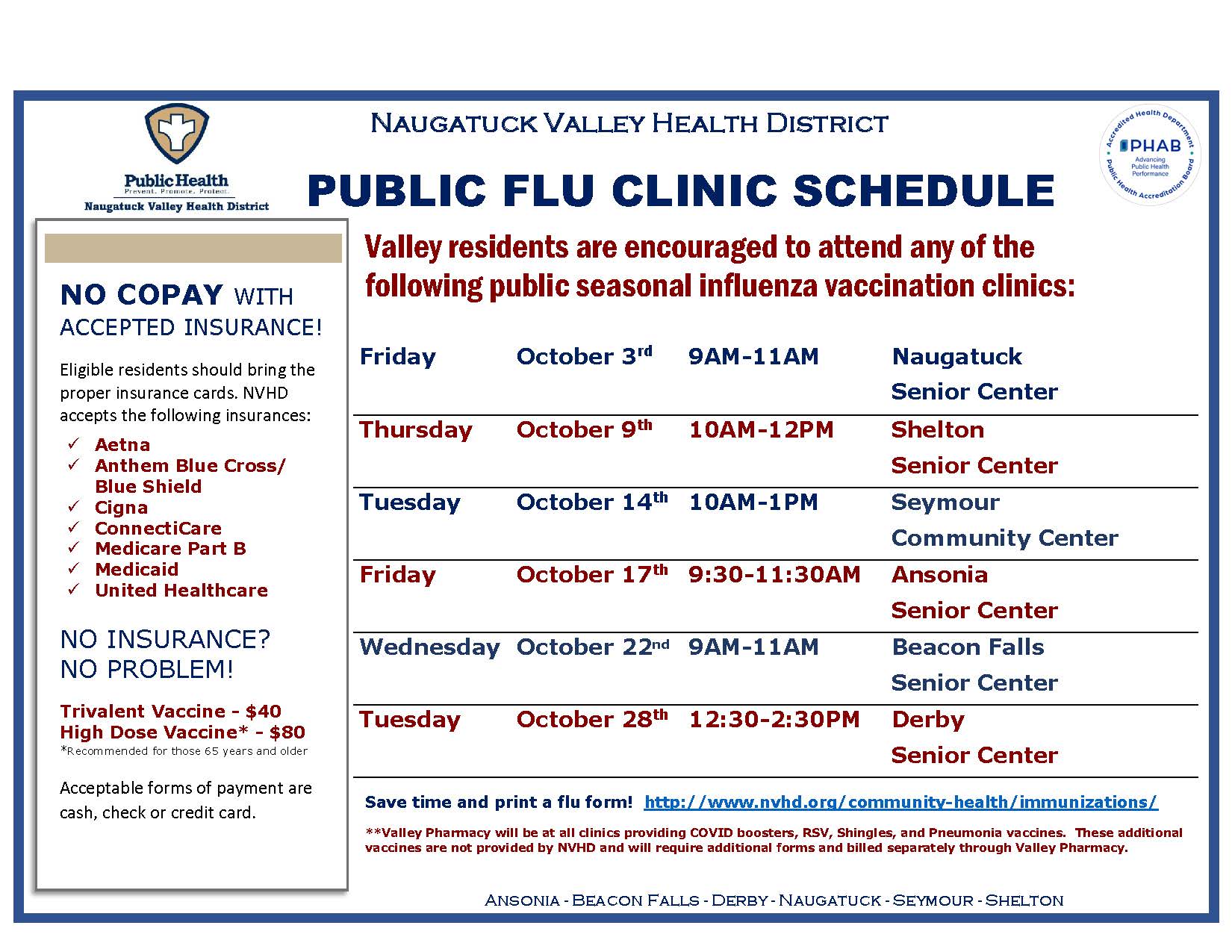 NVHD offers flu vaccinations to those 3 years and older throughout the fall and winter months. We offer the quadrivalent vaccine (ages 3 and up) and the high dose vaccine (ages 65 and older).  Clinics are held at various locations throughout the community, such as, senior centers, local businesses and at NVHD by appointment. Call Nurse Kristie to schedule an appointment: 203-881-3255 x 107.
