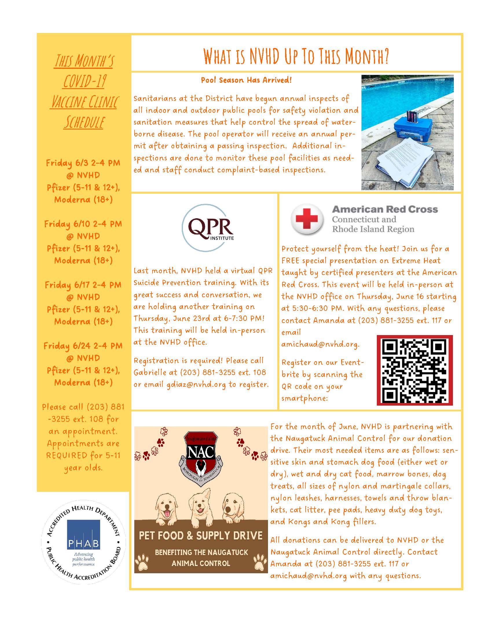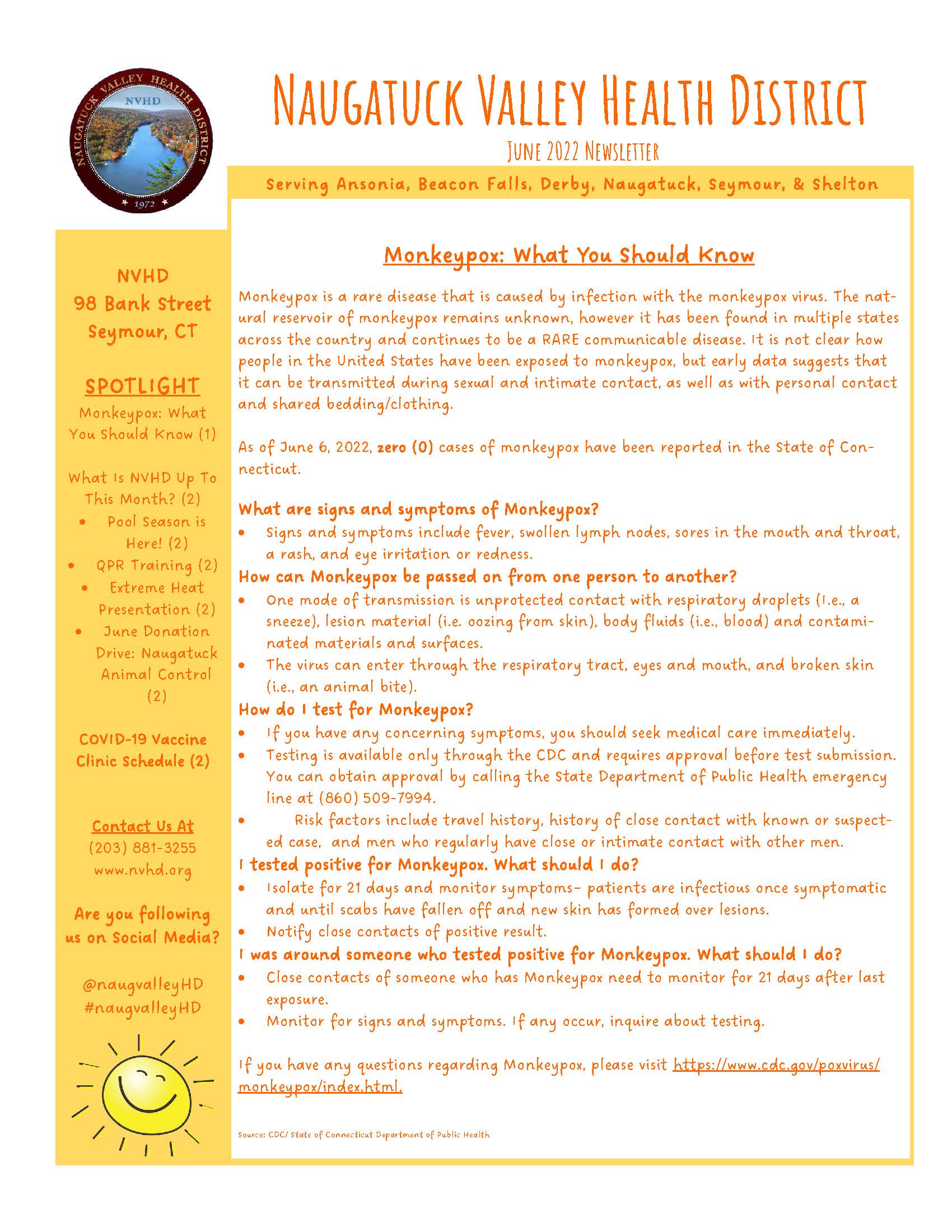 Issue Topics: Monkeypox FAQ; Pool Season; QPR Suicide Prevention Training; Extreme Heat Presentation; NVHD Gives Back Program highlights Naugatuck Animal Control in June!; COVID-19 Clinic Schedule.