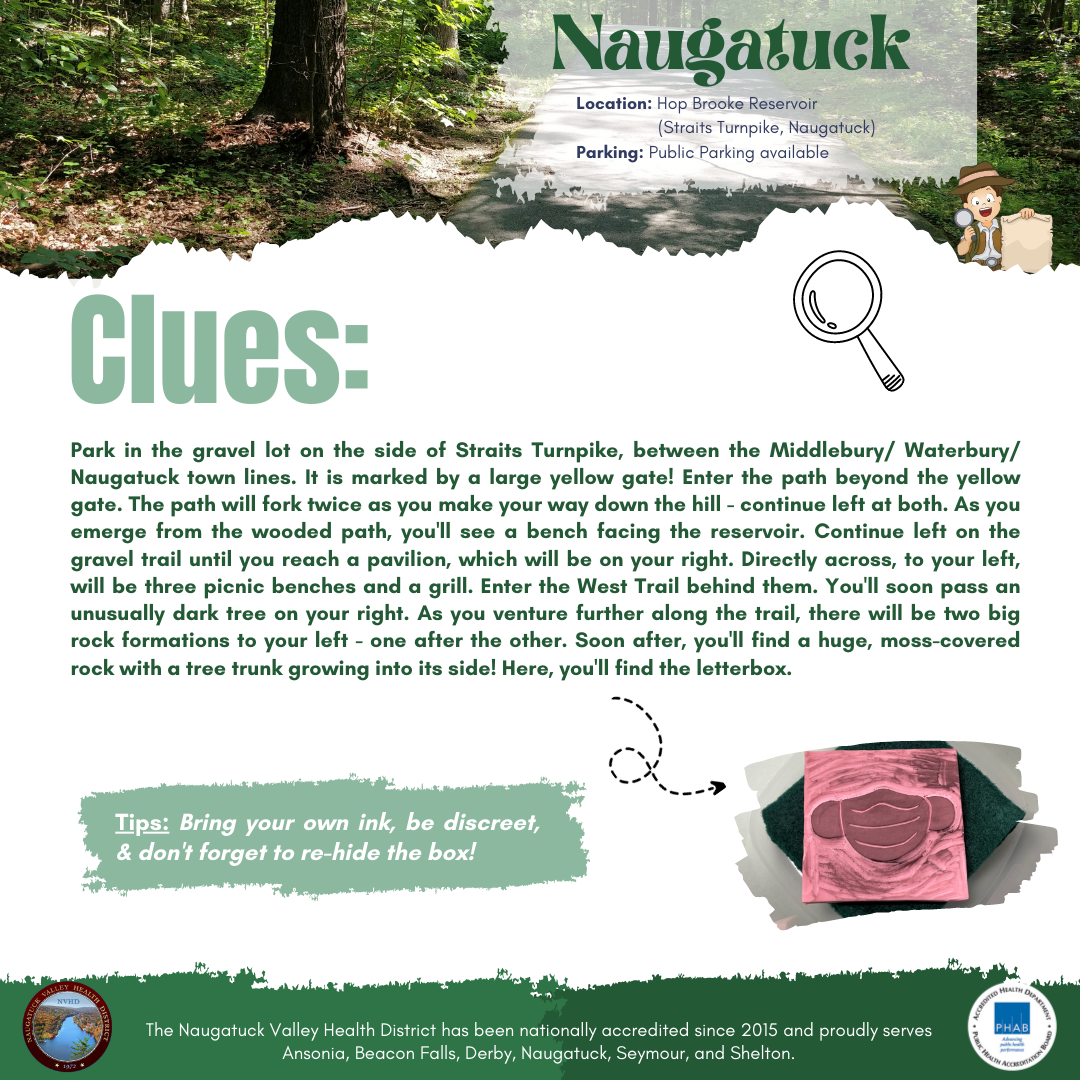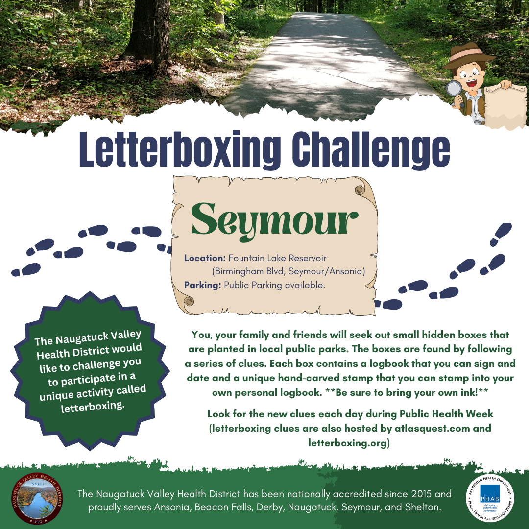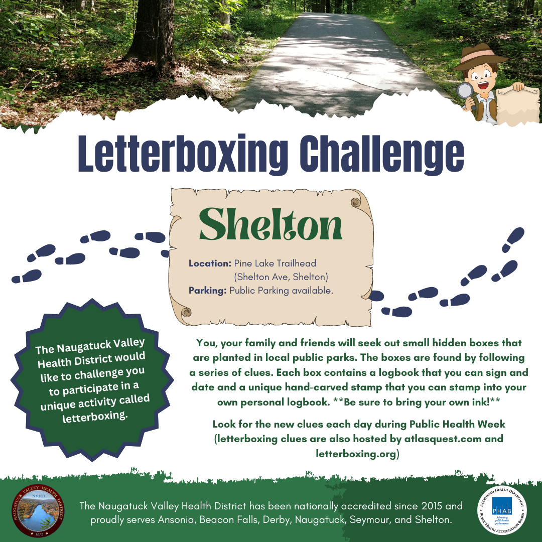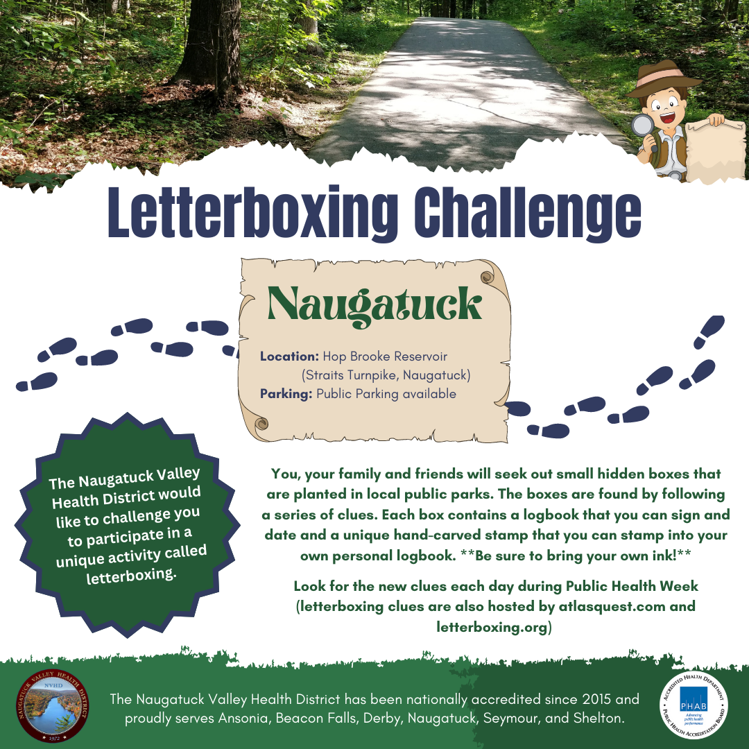 The Naugatuck Valley Health District would like to challenge you to participate in a unique activity called letterboxing. Our letterboxing series includes some public health information, it’s fun and a great excuse for you to get some fresh air and exercise. You, your family and friends will seek out small hidden boxes that are planted in local public parks. The boxes are found by following a series of clues. Each box contains a logbook that you can sign and date and a unique hand-carved stamp that you can stamp into your own personal logbook. We will post a new clue each day during Public Health Week (letterboxing clues are also hosted by atlasquest.com and letterboxing.org).