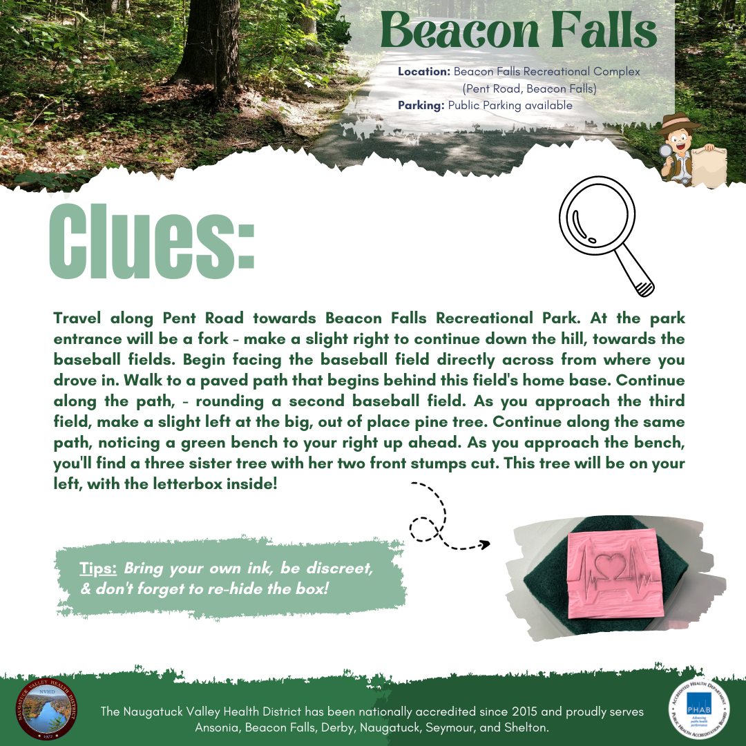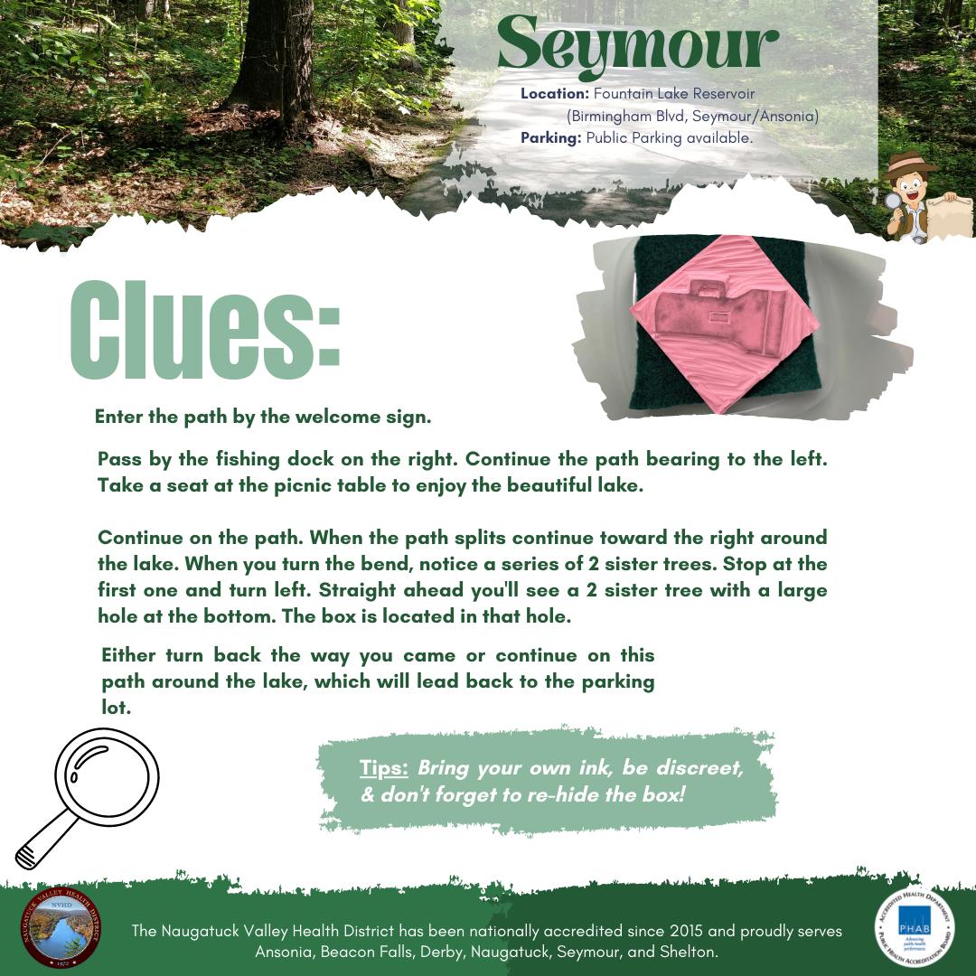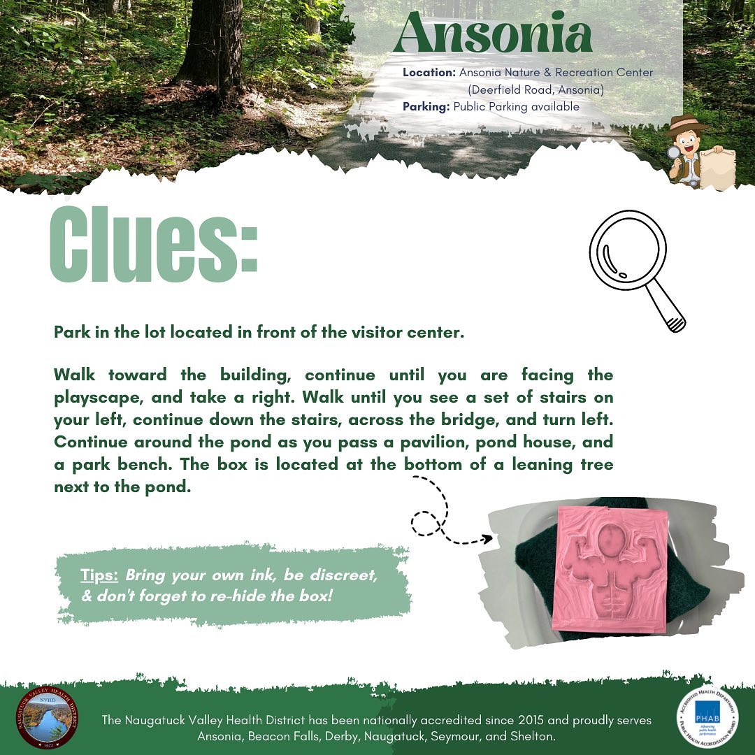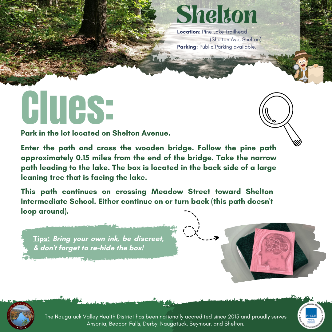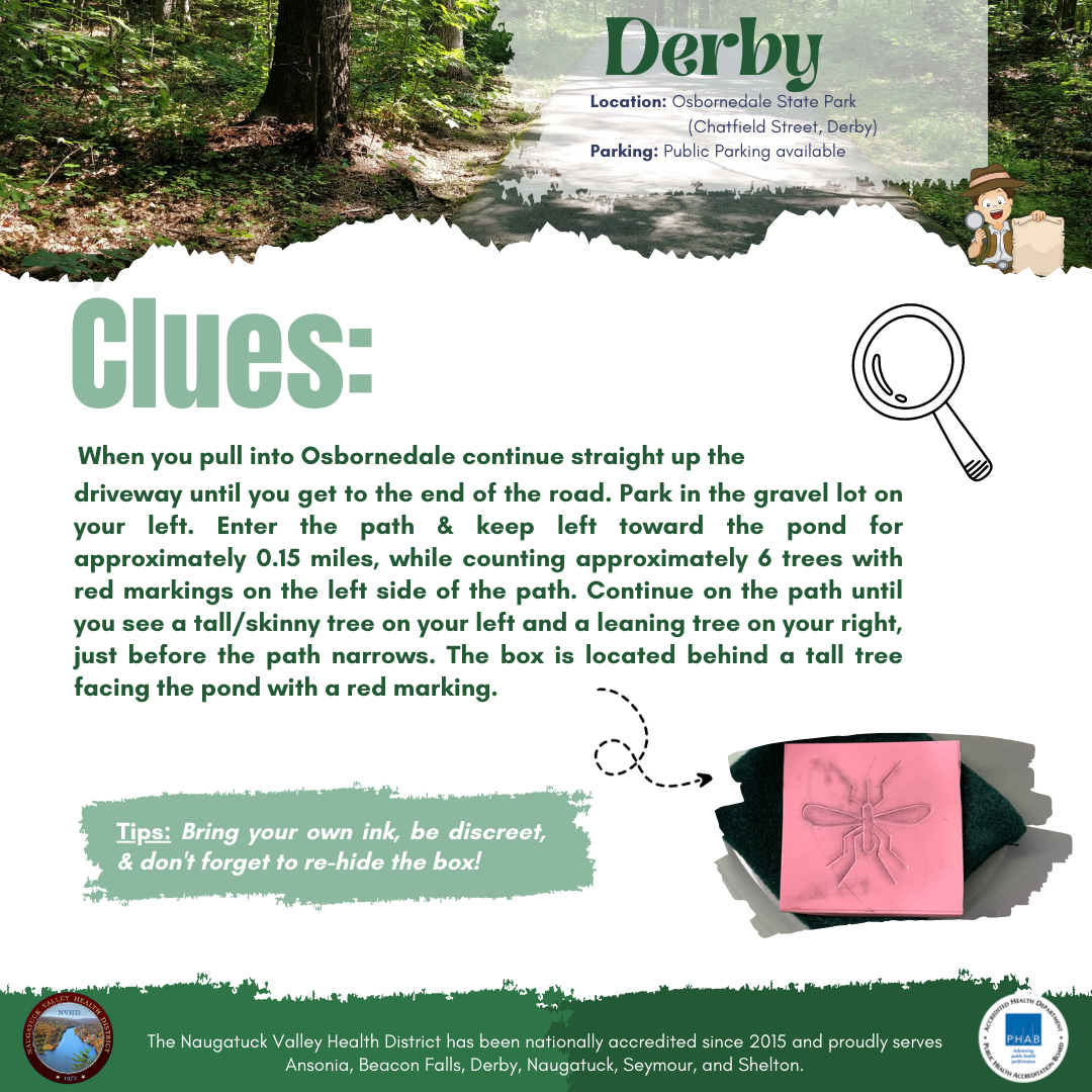 The Naugatuck Valley Health District would like to challenge you to participate in a unique activity called letterboxing. Our letterboxing series includes some public health information, it’s fun and a great excuse for you to get some fresh air and exercise. You, your family and friends will seek out small hidden boxes that are planted in local public parks. The boxes are found by following a series of clues. Each box contains a logbook that you can sign and date and a unique hand-carved stamp that you can stamp into your own personal logbook. We will post a new clue each day during Public Health Week (letterboxing clues are also hosted by atlasquest.com and letterboxing.org).