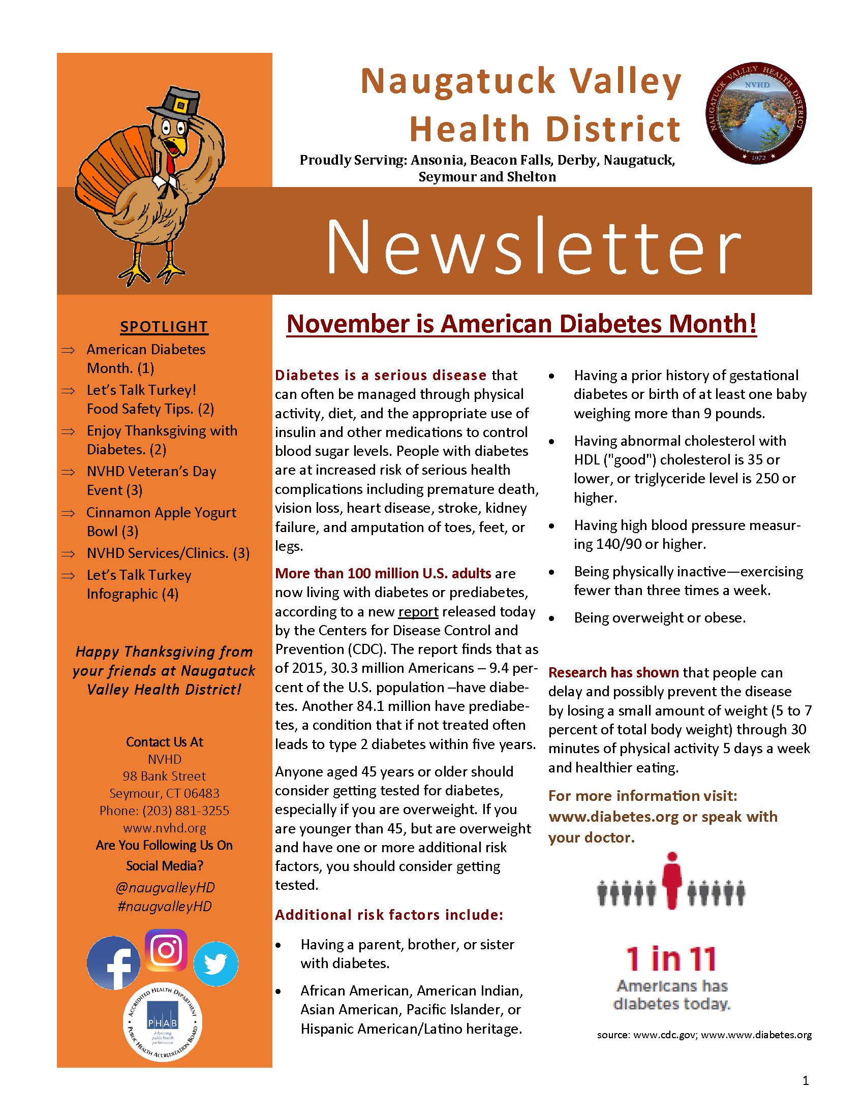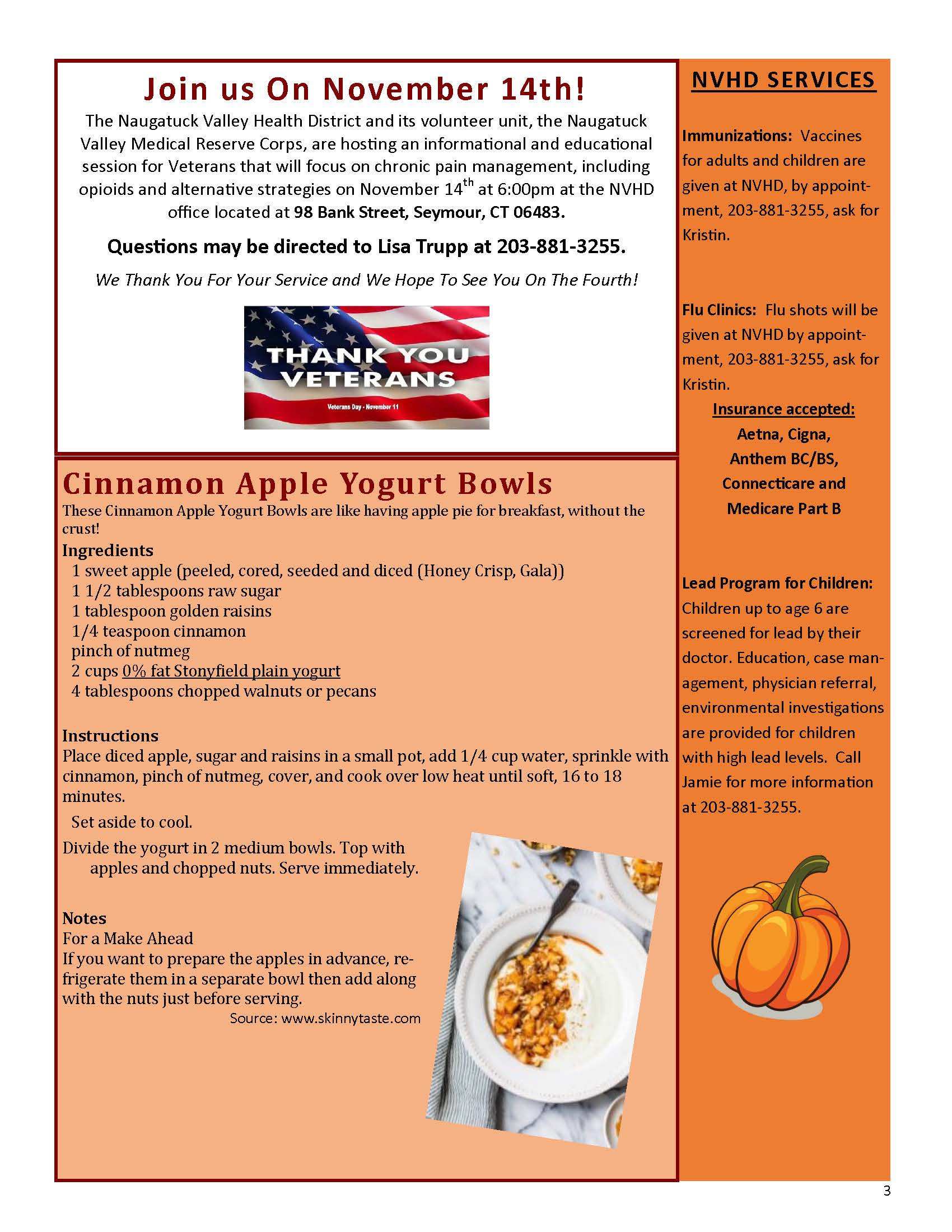 Issue Topics: American Diabetes Month; Thanksgiving Food Safety Tips; Enjoying Thanksgiving with Diabetes; Veteran’s Day Event at NVHD; Cinnamon Apple Yogurt Bowl Recipe; and more!