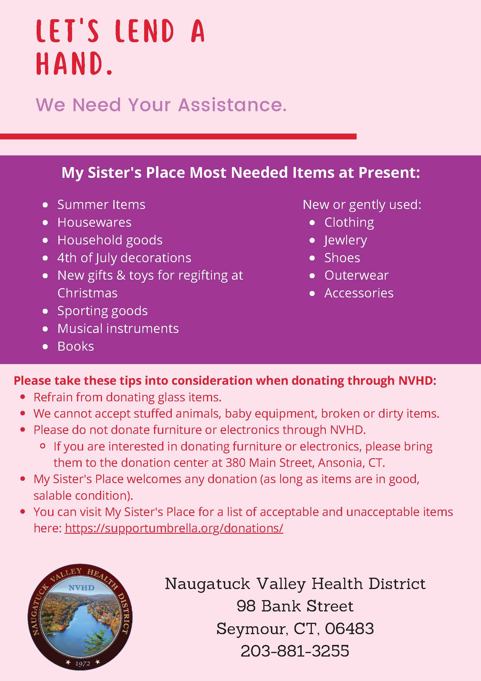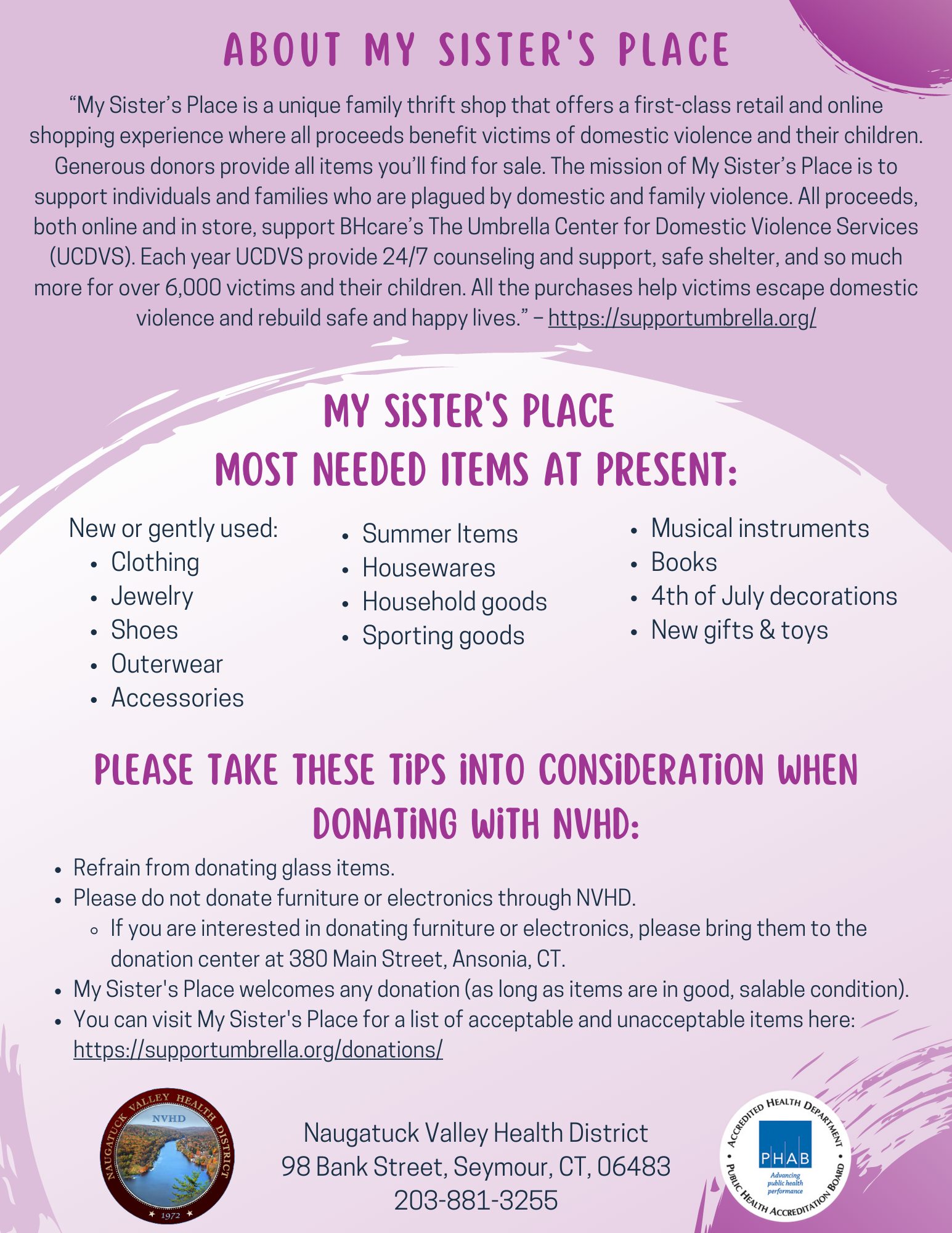 We will be seeking donations for My Sister’s Place in Ansonia. “My Sister’s Place is a unique family thrift shop that offers a first-class retail and online shopping experience where all proceeds benefit victims of domestic violence and their children. Generous donors provide all items you’ll find for sale. The mission of My Sister’s Place is to support individuals and families who are plagued by domestic and family violence. All proceeds, both online and in store, support BHcare’s The Umbrella Center for Domestic Violence Services (UCDVS). Each year UCDVS provide 24/7 counseling and support, safe shelter, and so much more for over 6,000 victims and their children. All the purchases help victims escape domestic violence and rebuild safe and happy lives.” – https://supportumbrella.org/