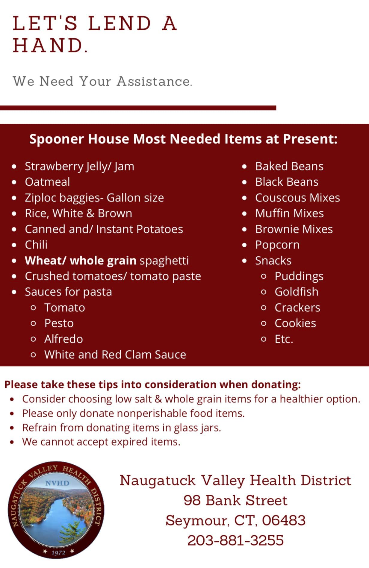 During the month of April, we were seeking donations for Spooner House in Shelton. “Spooner House is operated by Area Congregations Together, Inc. with the mission of providing food, shelter and support services to people in need. All of our energies are devoted to helping our clients establish a self-sufficient living situation. We recognize the dignity of our clients; we give them our respect and we deliver our services without proselytizing.” – http://www.actspooner.org.
