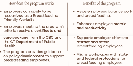 The Naugatuck Valley Maternal Child Health Coalition’s Breastfeeding-Friendly Worksite Initiative, in partnership with the CBC, recognizes employers who actively support breastfeeding employees. This program also provides resources for employers who want to create a breastfeeding-friendly worksite and continue to foster a workplace culture that supports breastfeeding and pumping. To learn more on how to apply visit:Breastfeeding Friendly Worksites