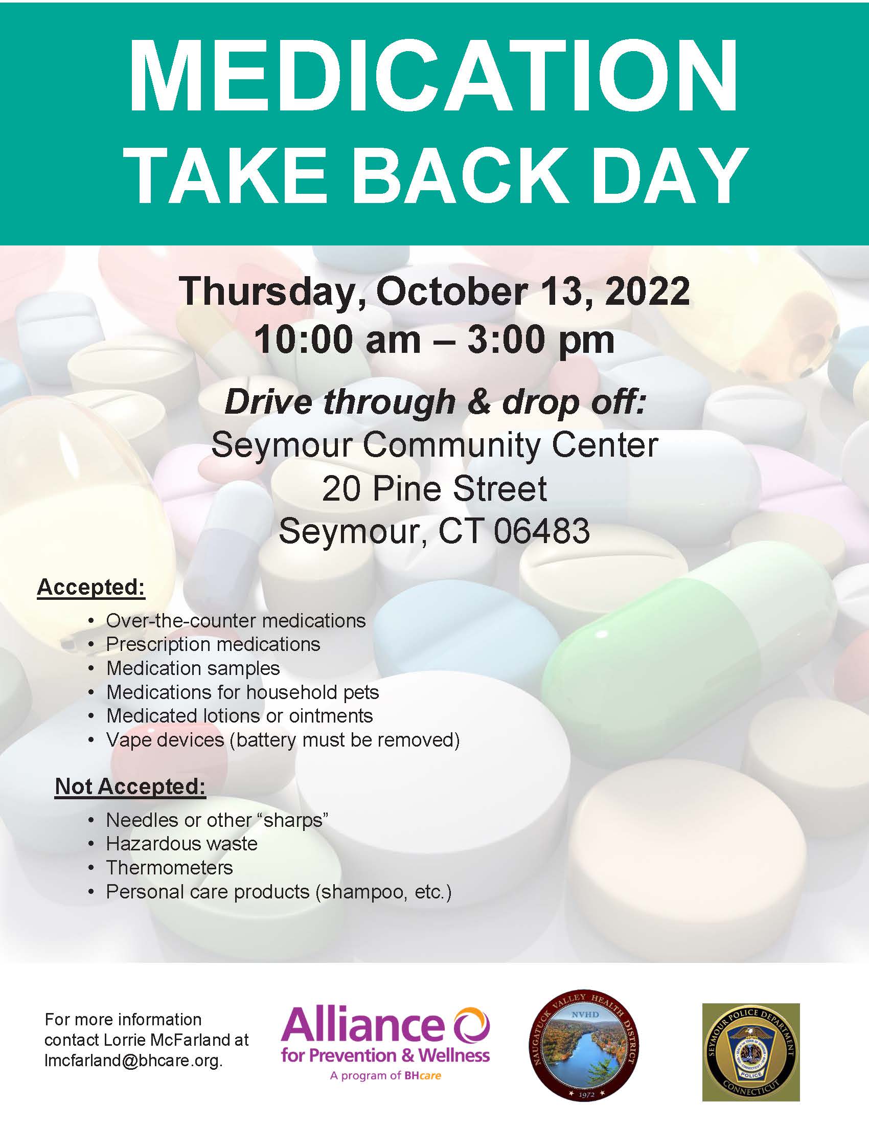 Questions regarding the Seymour Medication Take Back Event should be directed to Lorrie McFarland, MS, MCHES, CPS-R, Prevention Coordinator for BHcare’s Alliance for Prevention & Wellness at lmcfarland@bhcare.org.
